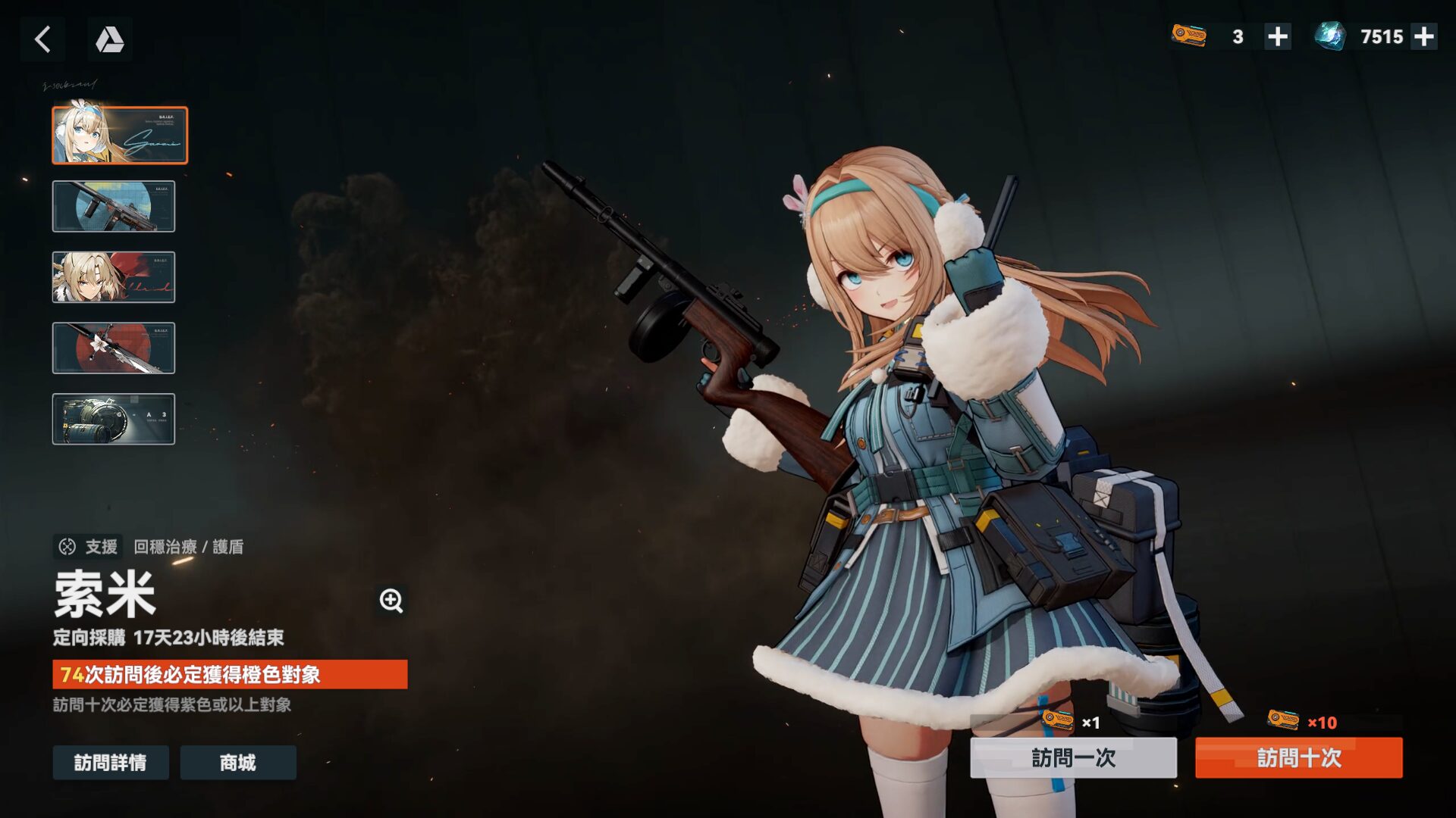 《少女前線2:追放》新手開局就抽到一個強力的角色,能讓你的新手開荒更加順暢,定向採購 抽到全隊上盾、治療角色 “索米“,能讓你未來關卡角色被打死機率大幅降低。常規採購 抽到火力輸出 “瓊玖“,新手開場就能組成一隊強力燃燒、追擊隊伍,打王非常快速。 以下是推薦的首抽角色: