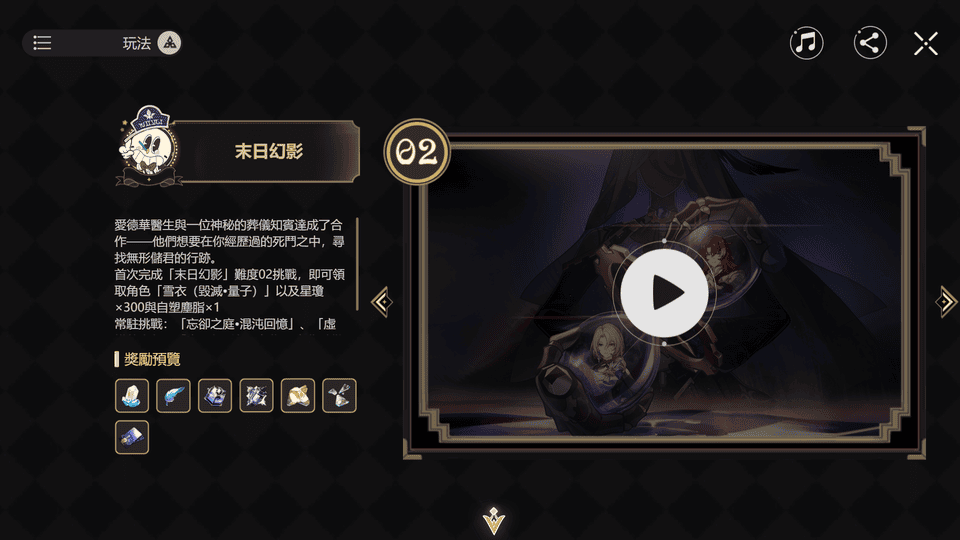 新的常駐挑戰玩法「末日幻影」每期挑戰兩位頭目,成功挑戰後可獲得四星角色「雪衣」及其他獎勵。