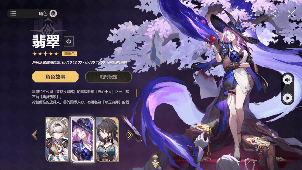 翡翠則是公司「策略投資部」的高級幹部,擁有量子屬性。她的技能包括與角色簽訂契約,提供強化效果,同時消耗生命值。翡翠擅長在戰鬥中使用契約來累積充能,進行強力的追加攻擊。
