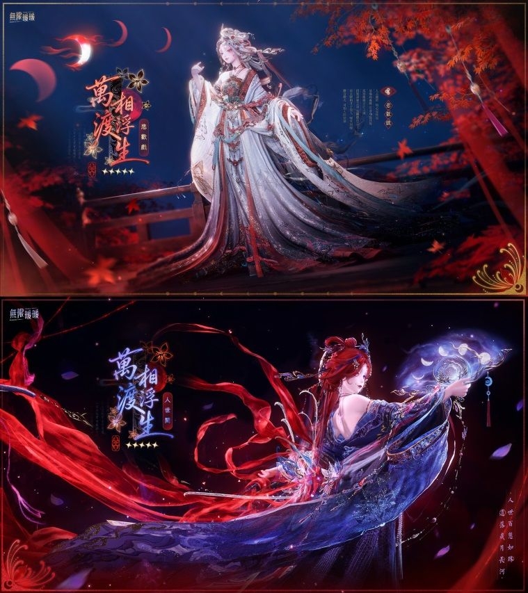 兩套全新五星套裝各自展現了不同的中式美學,「九色亦塵心」以「靈鹿」之意象,呈現輕盈空靈的仙宴之姿;「萬相渡浮生」則繁複細緻的繡紋與飄帶流光,勾勒燈市夜色中百態浮生的妖魅風華。
