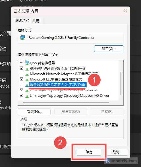 圖/取消勾選 網際網路通訊協定第 6 版 (TCP/IPv6) → 確定