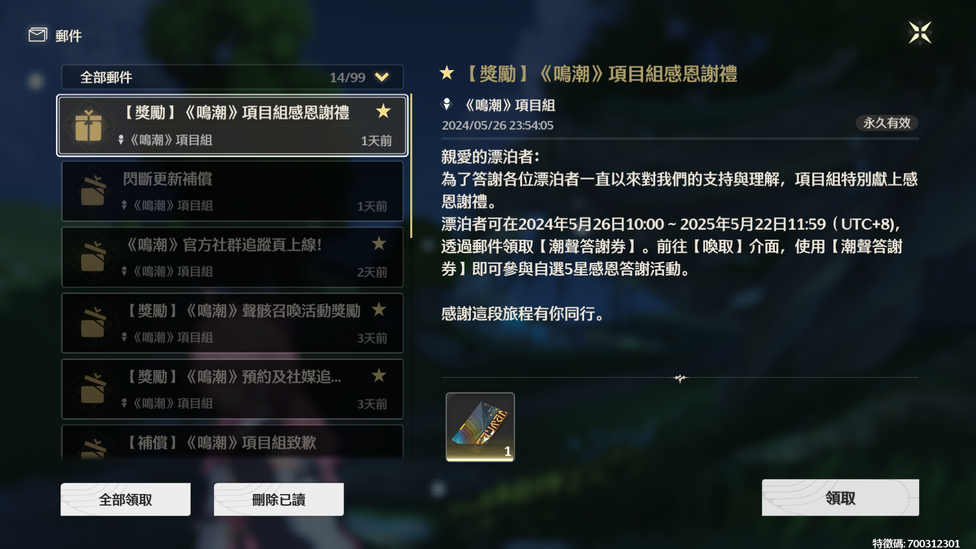 所以,小翔這裡還是建議將最近鳴潮官方送的 自選 5 星感恩答謝活動 先保留下來,不要這麼早用掉,反正還有 360 天的時間可以選擇,我們可以靜待未來的變化,再根據環境來使用。
