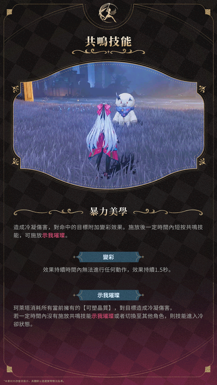 - 變彩效果結束後可施放示我璀璨,消耗所有【可塑晶質】進行高傷害攻擊,適合打單體或高抗性的敵人。