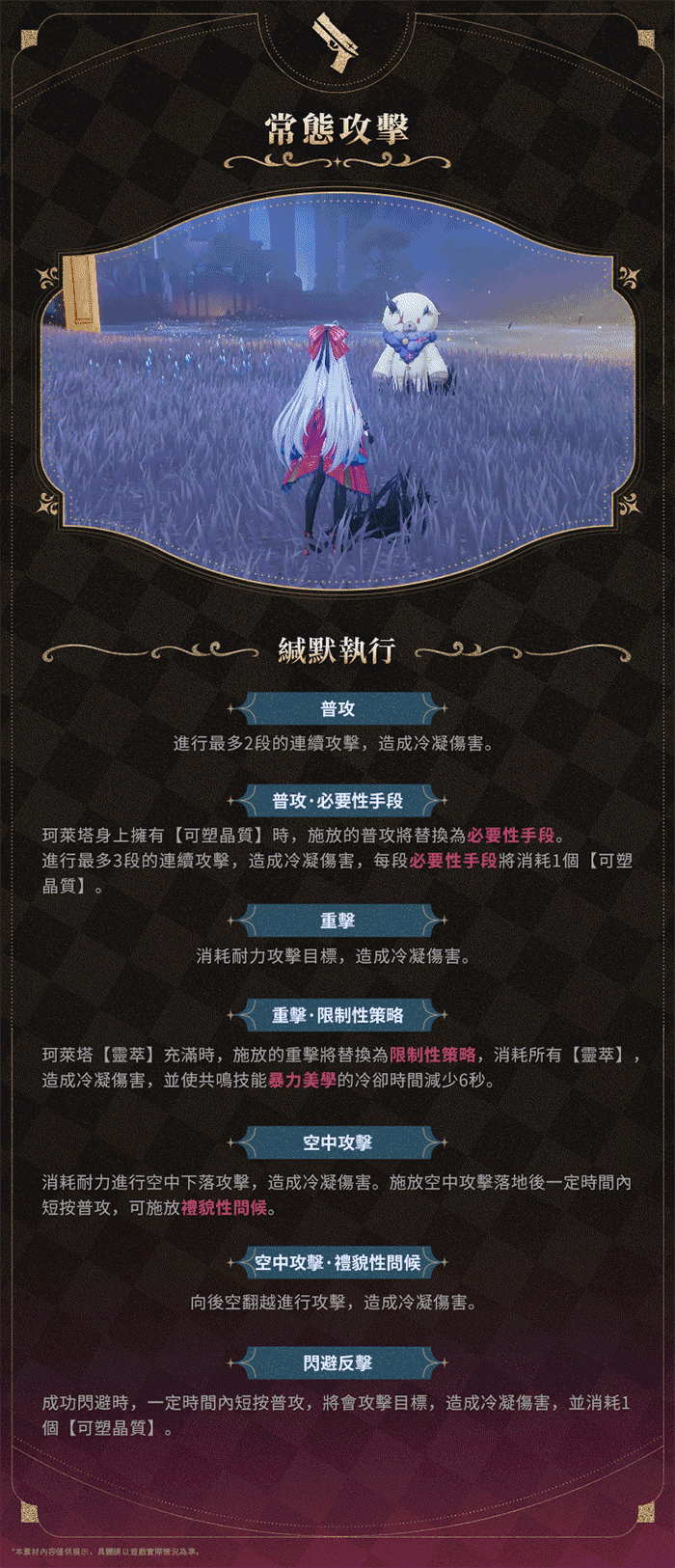 - 普通攻擊:最多2段連續攻擊,造成冷凝傷害。