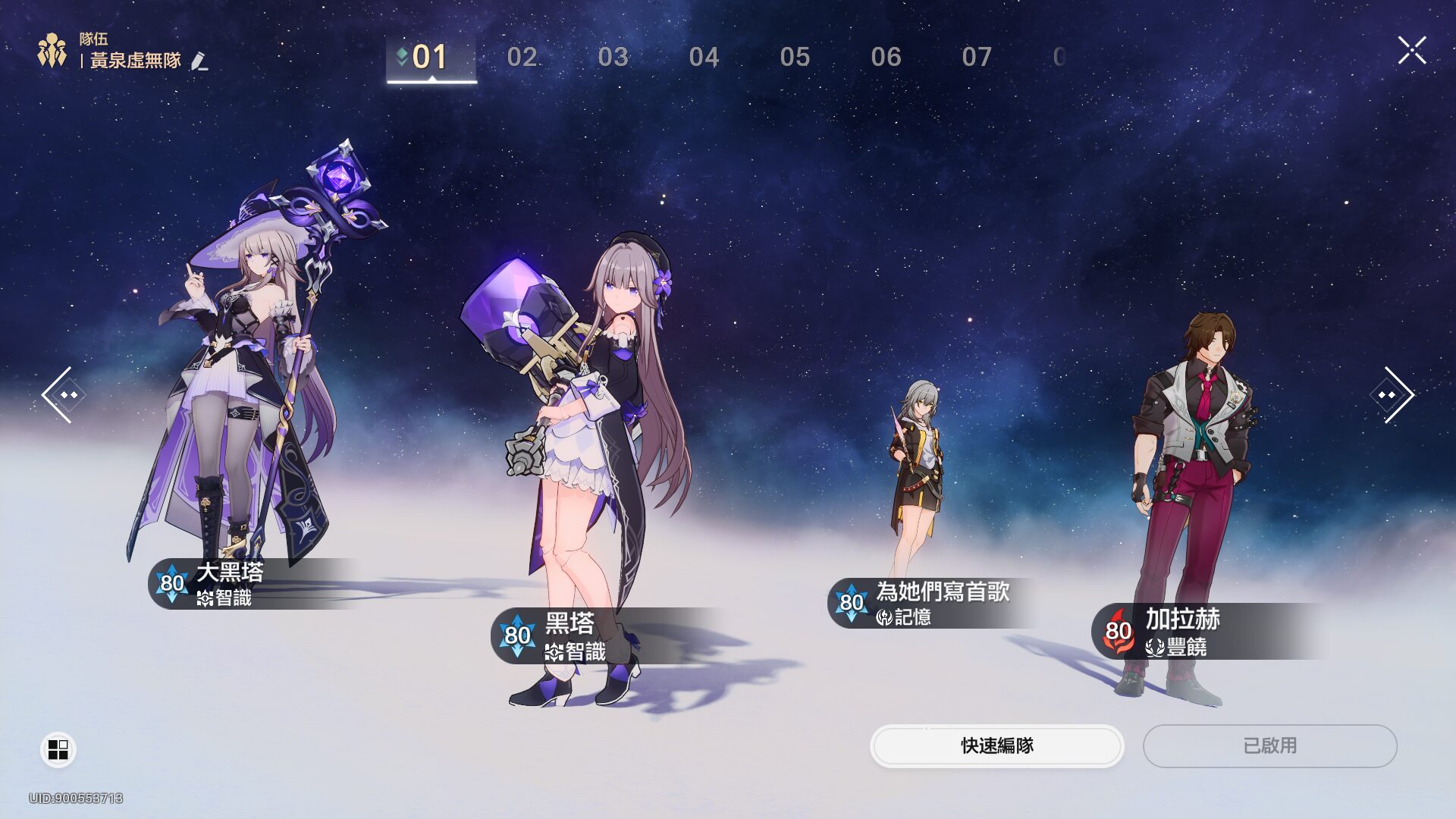平民雙核輸出隊伍,由 大黑塔、黑塔來輸出,記憶主提供穩定的全隊曾傷/拉條效果,整體隊伍可快速觸發迷迷的充能效果,並能讓大黑塔能專注輸出,靈砂回血產點。適合打虛構、渾沌關卡。