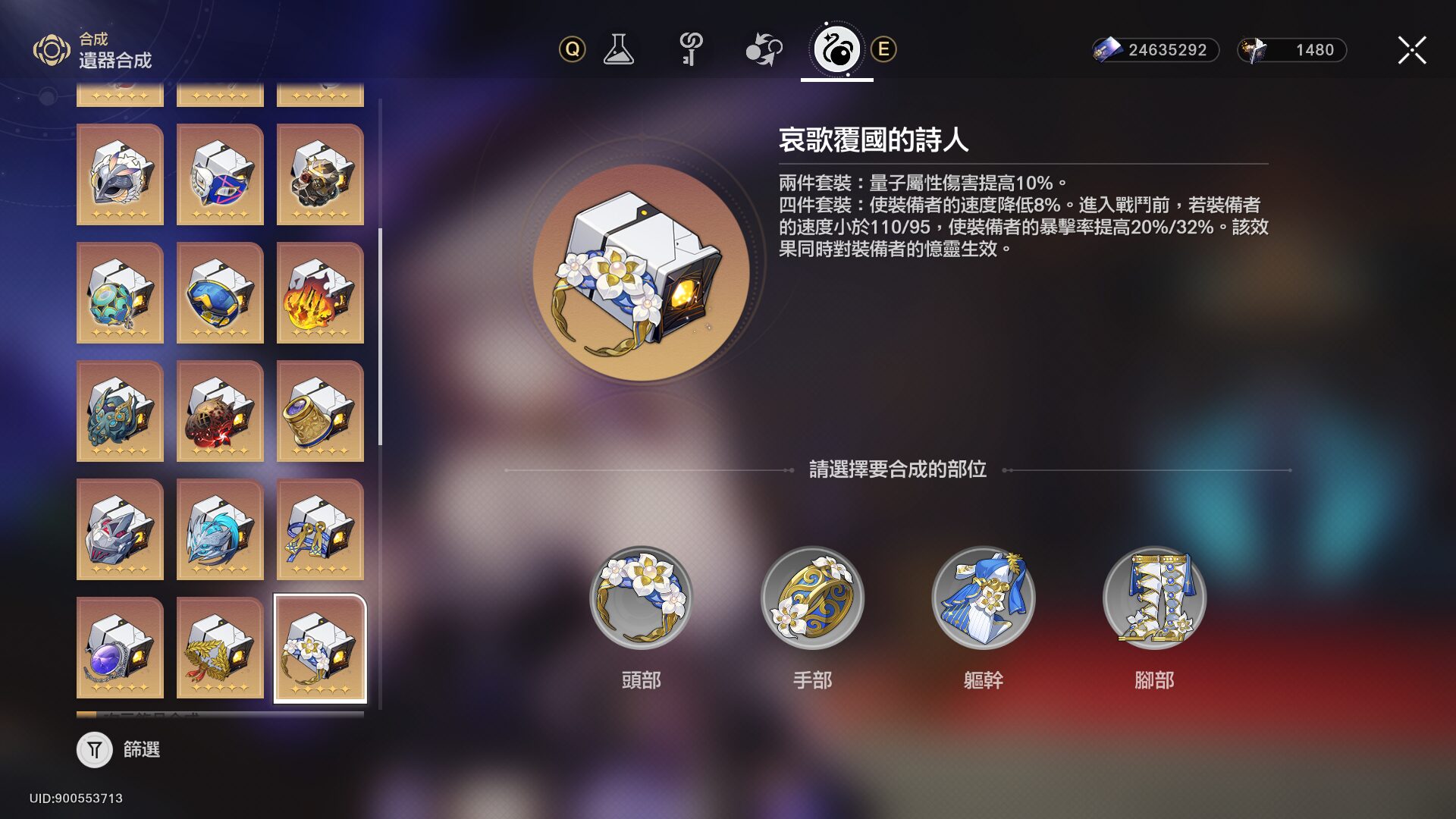 哀歌覆國的詩人 4 件套,可使裝備者的速度降低,並提高裝備者的暴擊率以及量子屬性傷害。且裝備效果同時對裝備者的憶靈生效。是最適合遐蝶的外圈遺器。