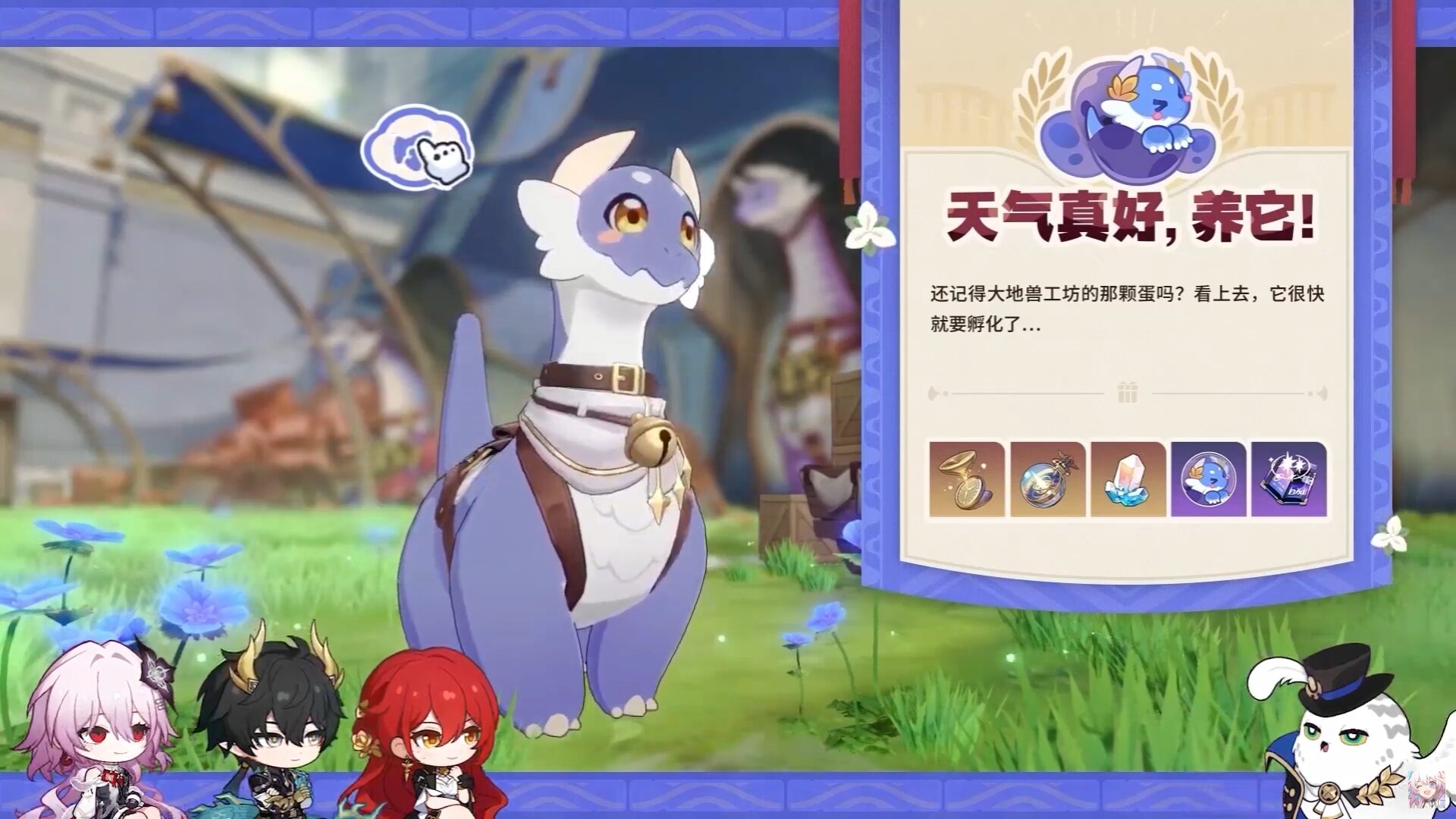 孵化後,這隻小大地獸會稱呼開拓者為父母。玩家需要透過 安排日程、餵食(如圖片中餵食紅色礦石)、玩耍 等多種互動方式來養育牠。玩家的每一個養成決策,都會影響這隻小大地獸的屬性與特質,最終將牠培養成獨一無二的樣貌。