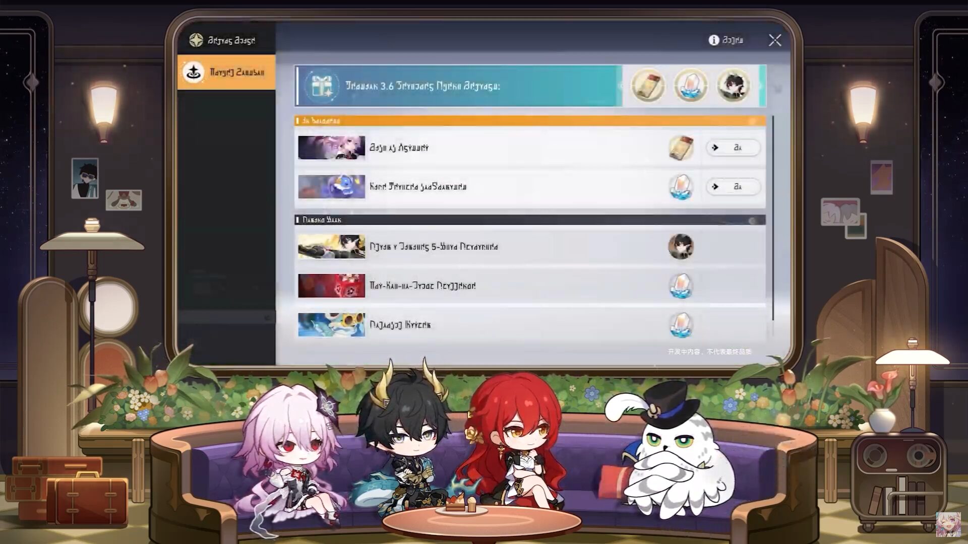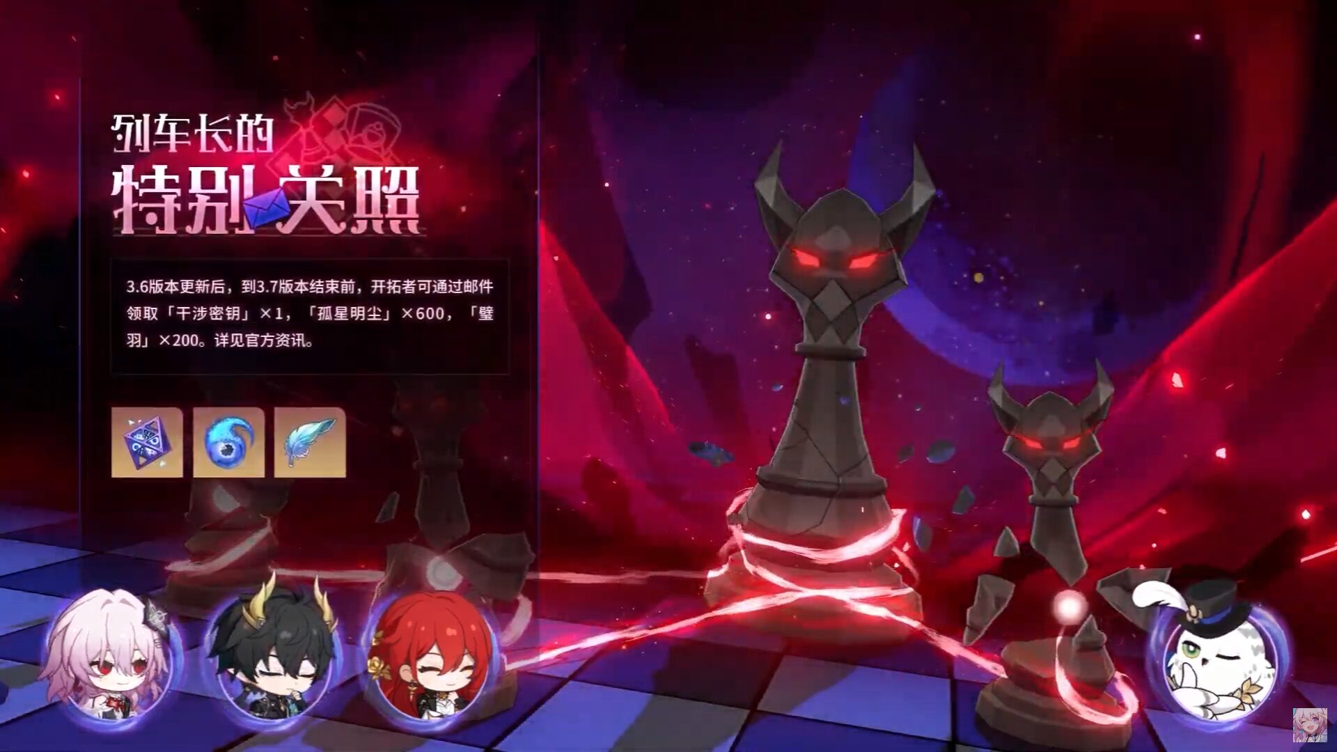 此外,為了慶祝新玩法上線,版本更新後將有「列車長的特別關照」郵件,贈送「干涉密藥」、星瓊等豐富獎勵。列車長的特別關照 為了慶祝新玩法上線,所有玩家都能透過郵件領取包含全新道具「干涉密藥」在內的豐厚獎勵: