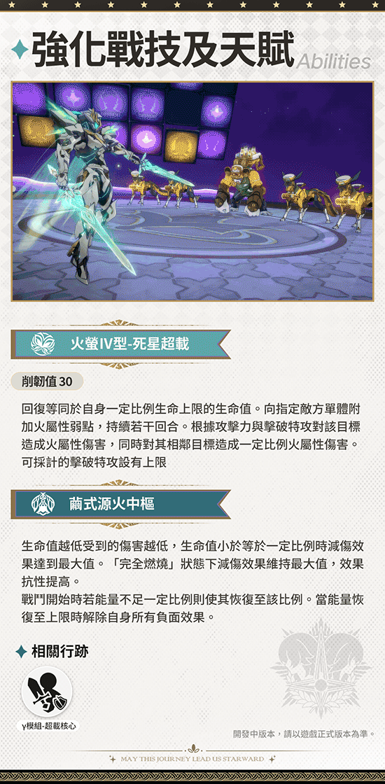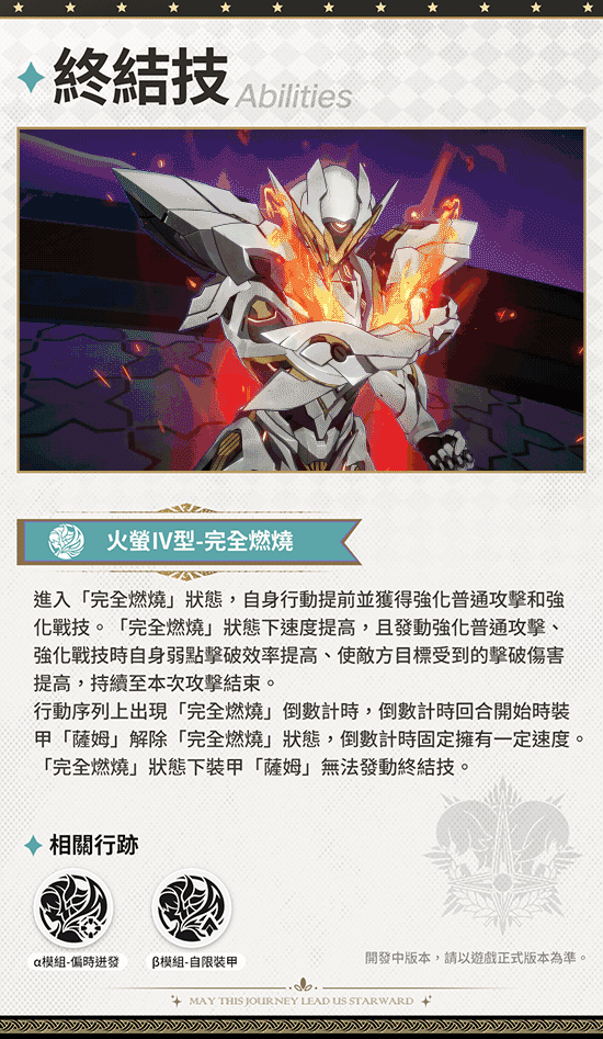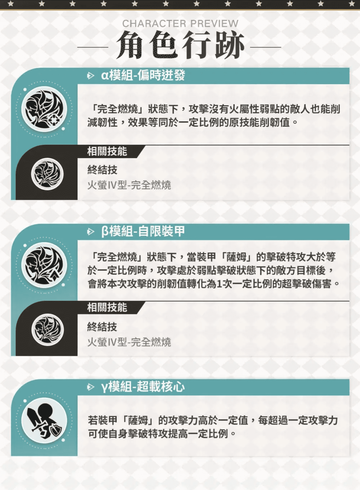 「完全燃燒」狀態下,當裝甲「薩姆」的擊破特攻大於等於200/360%時,攻擊處於弱點擊破狀態下的敵方目標後,會將本次攻擊的削韌值轉換為1次35/50%的超擊破傷害。