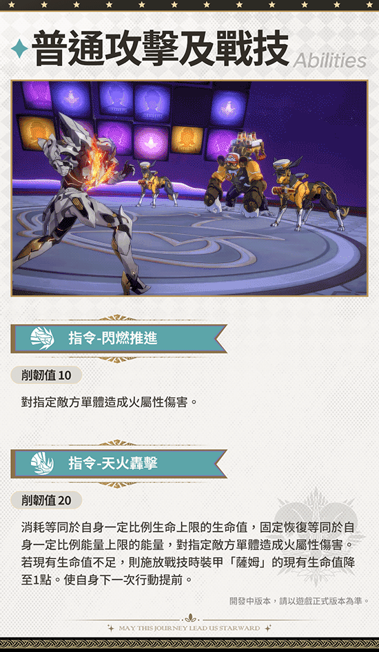 消耗等同於自身生命上限40%的生命值固定恢復等同於自身60%能量上限的能量,對指定敵方單體造成等同於裝甲「薩姆」 20%攻擊力的火屬性傷害。 若當前生命值不足,施放戰技時裝甲「薩姆」的當前生命值降至1點。使自身下一次行動提早25%。