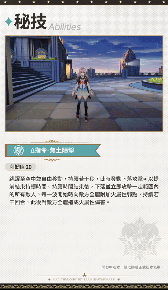 跳躍至空中並進行自由移動,持續 5 秒,此時施放下落攻擊可以提前結束持續時間。 持續時間結束後,下落並立即攻擊一定範圍內的所有敵人,每個波次開始時為敵方全體添加火屬性弱點,持續 2 回合,此後對敵方全體造成等同於裝甲 “薩姆” 200% 攻擊力的火屬性傷害。